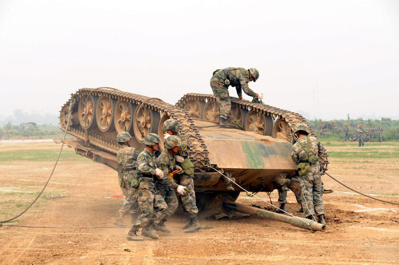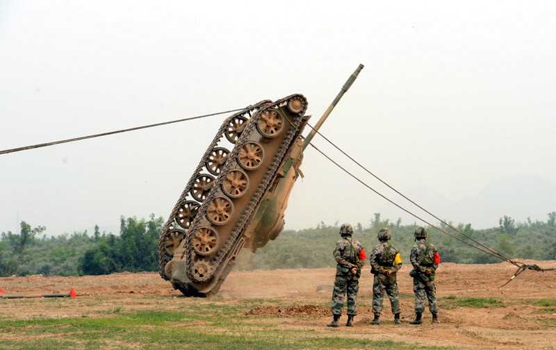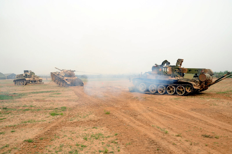 6月29日,北京军区基础比武进入第二天,装甲抢救车牵引训练坦克驶入比武现场。图片来源:新华网 高航 摄