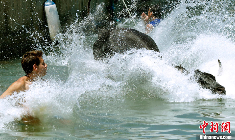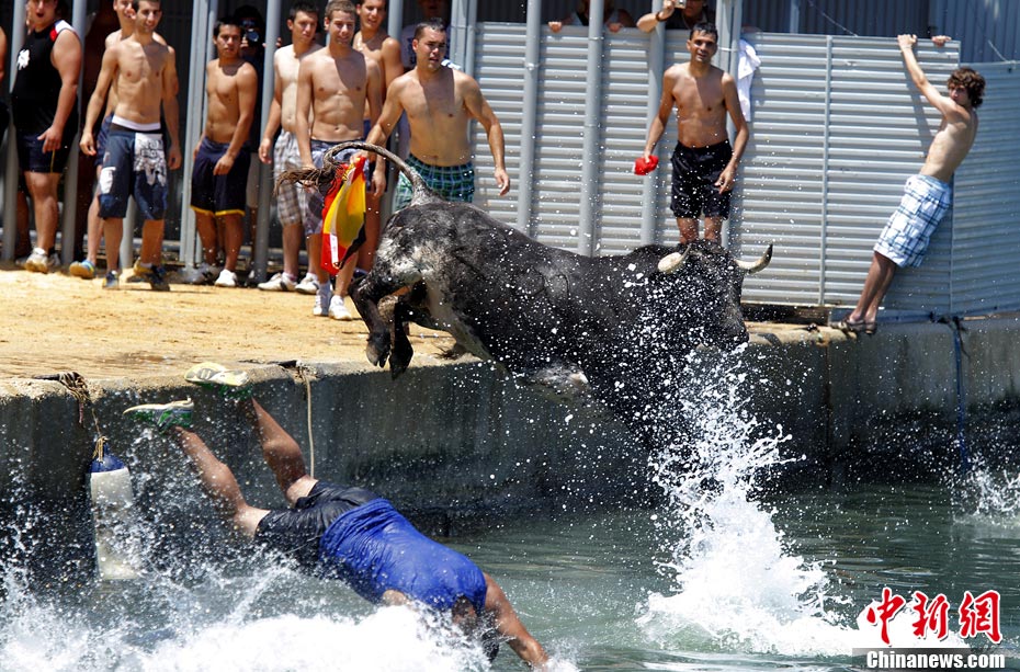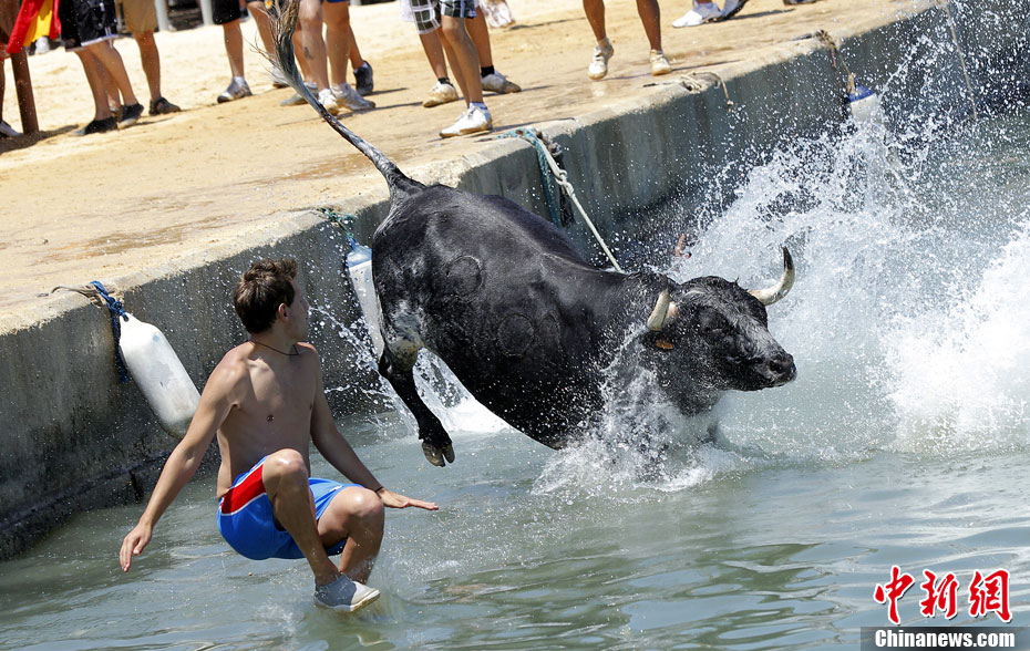 西班牙海边斗牛盛事“奔牛入海”