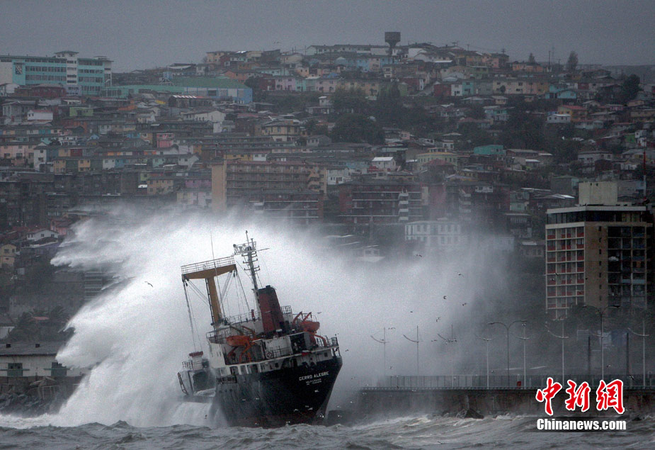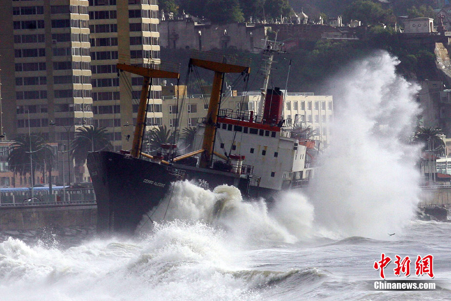 7月6日,受强风、暴雨等恶劣天气影响,智利中南部地区多处重要海港被迫封锁。在智利瓦尔帕莱索港口,一艘货轮因强风搁浅,并在巨浪冲击下撞向岸堤。