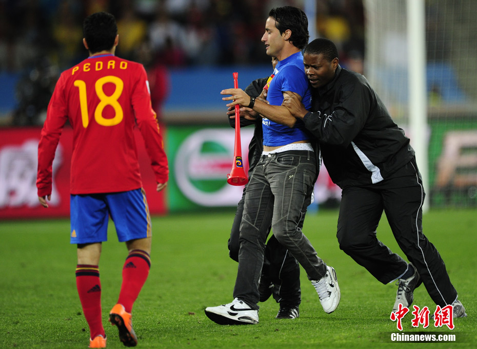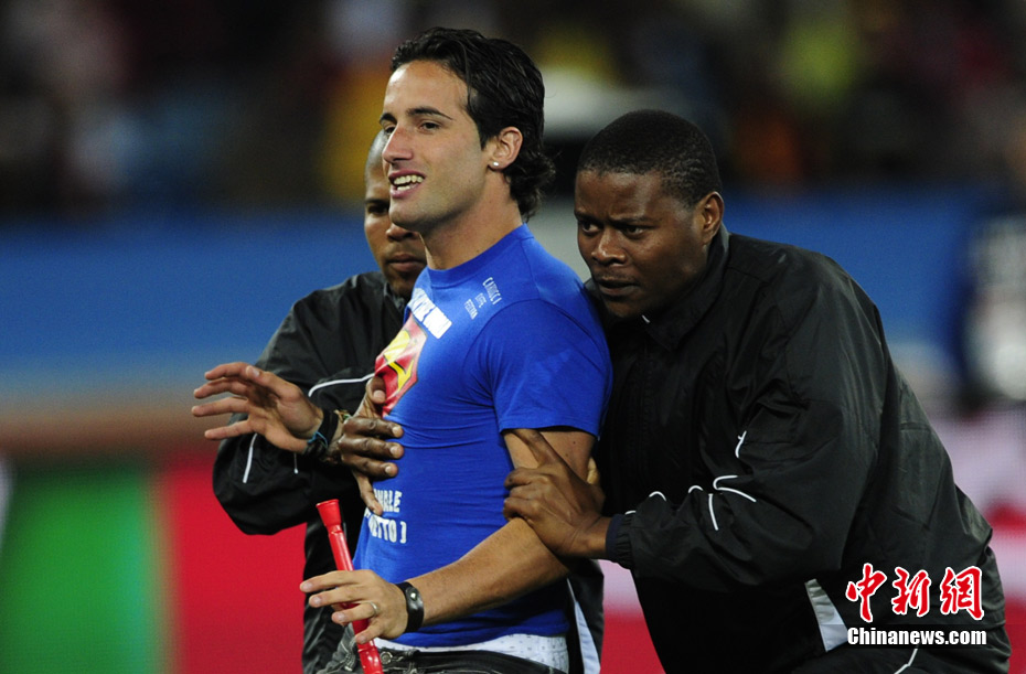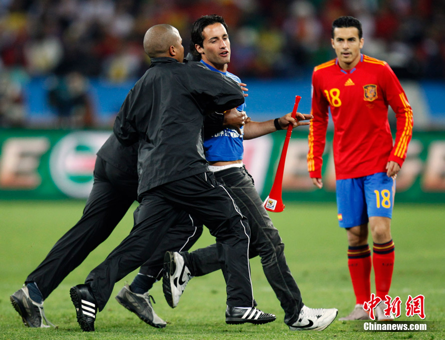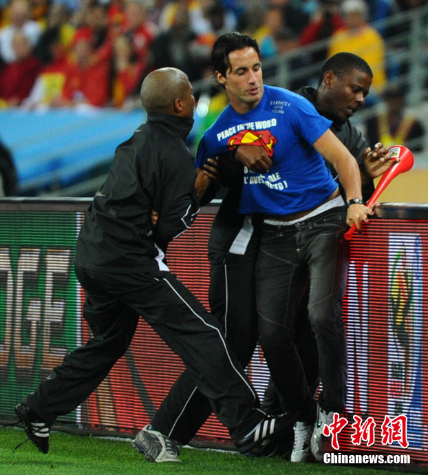 西班牙队和德国队激战正酣时。一名球迷身穿超人背心突然闯进球场,此时双方的比赛短暂地暂停了一会儿,球迷被保安推出了球场。后经有关部门证实,这是一名意大利球迷。