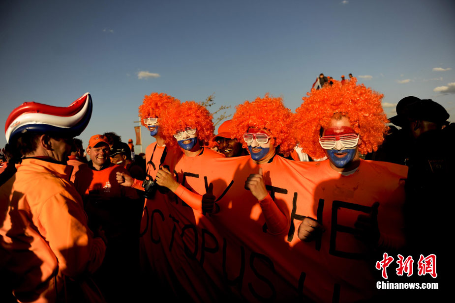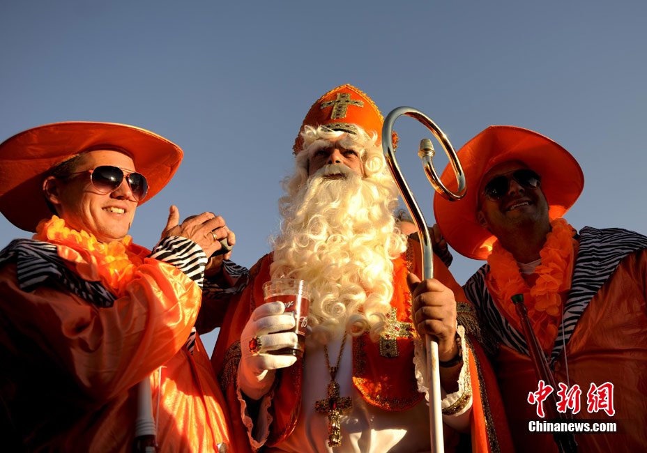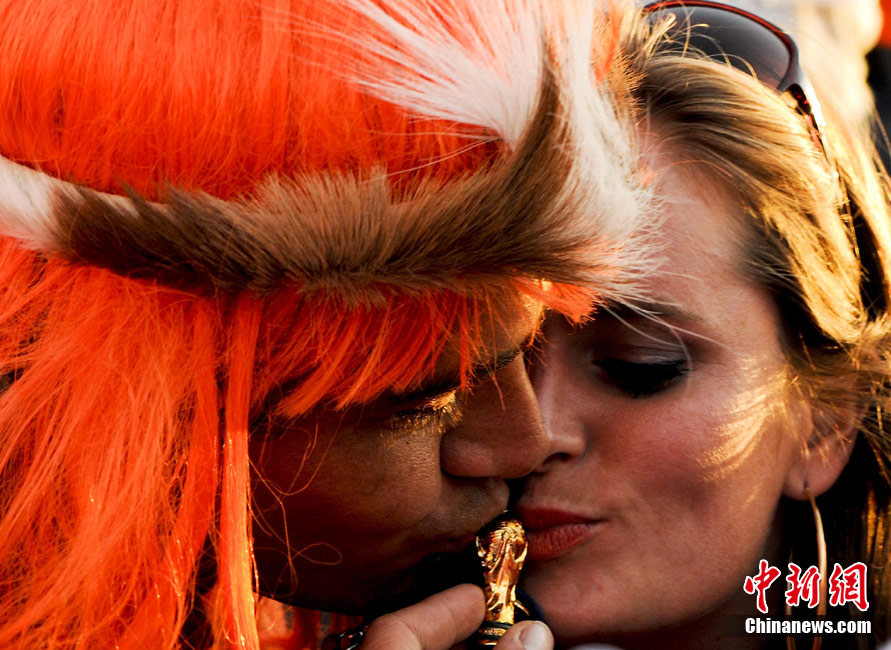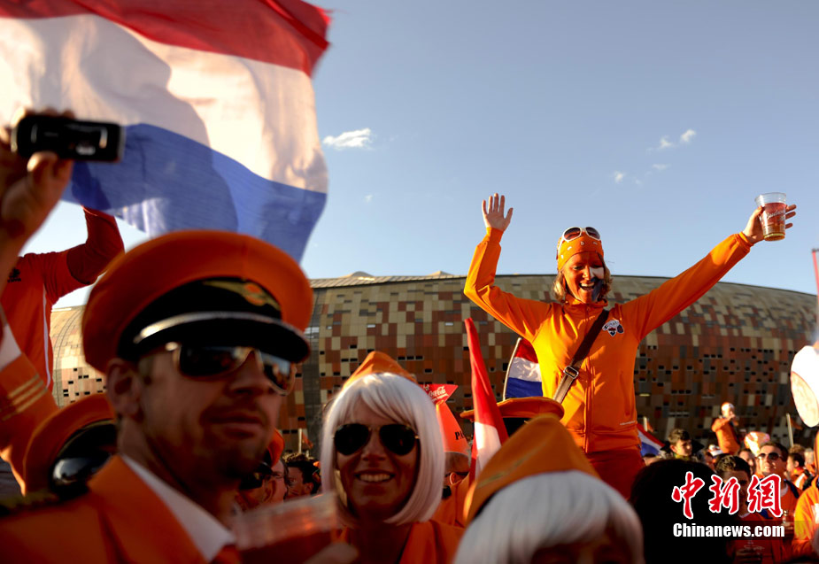 7月11日,南非约翰内斯堡足球城,众多荷兰球迷在足球城球场外激情舞蹈。当晚,南非世界杯荷兰对西班牙的决赛将在足球城球场举行。中新社记者 廖攀 摄