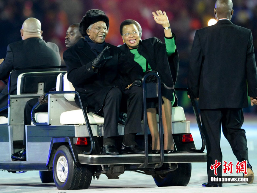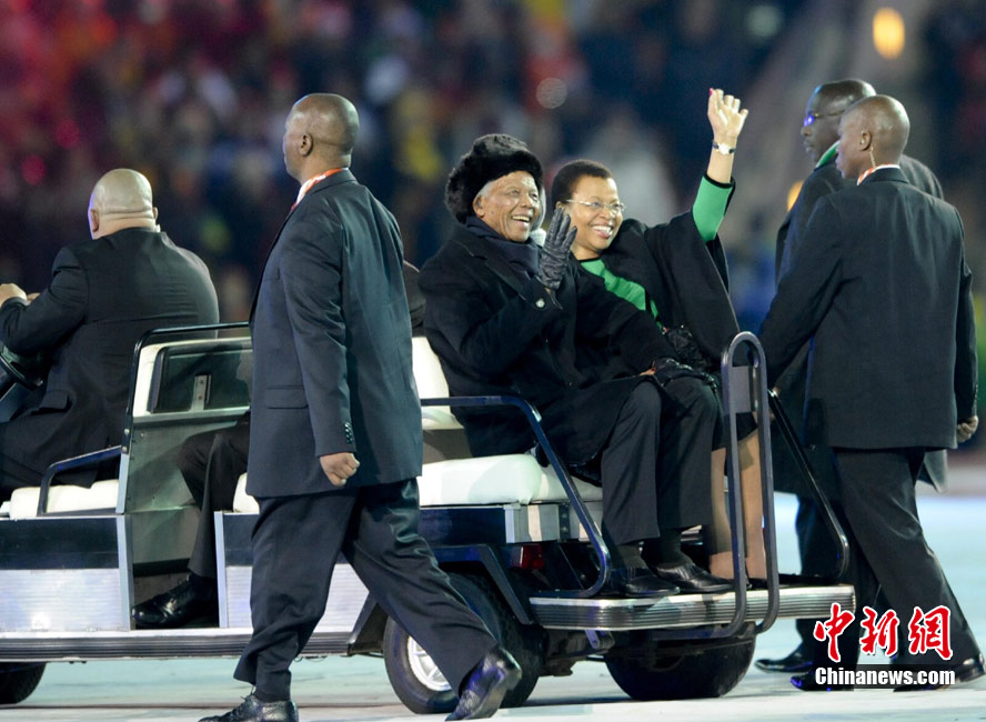 北京时间7月12日凌晨0:45,南非世界杯闭幕式拉开帷幕,在这场兼具活力和高科技的精彩表演中,洋溢着浓郁的非洲风情,成为即将在2:30打响的荷兰与西班牙决赛的最好垫场戏。图为南非前总统纳尔逊曼德拉出席闭幕式。中新社记者 廖攀 摄