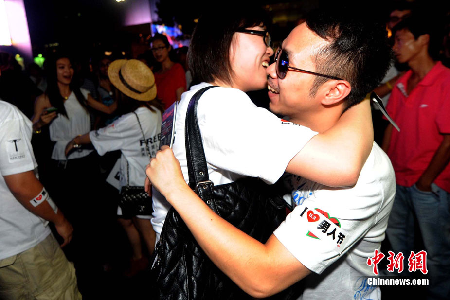 8月3日晚,在北京三里屯,俊男靓女们举起Free Hug(免费的拥抱)的大牌子,向陌生人们发起了自由拥抱的邀请,现场千人不分男女老少相互拥抱致意。“Free Hug”活动起源于欧美,是一种倡导关心和理解的交流方式。中新社发 李学仕 摄