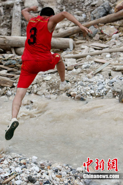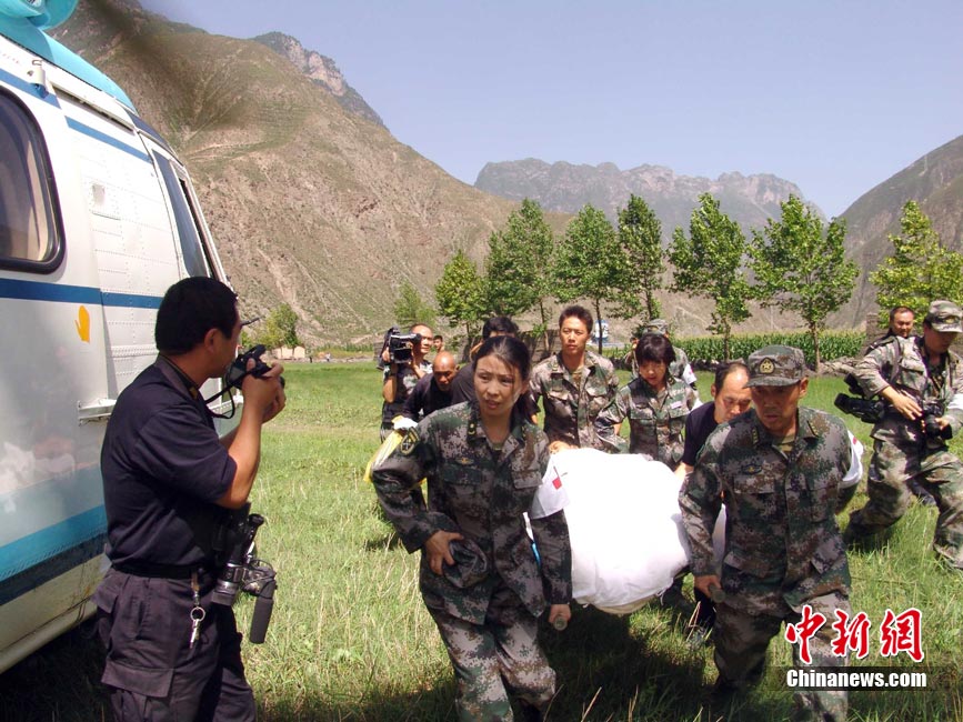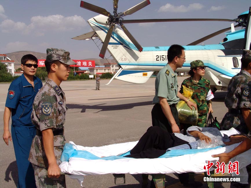 8月15日,中国空军动用2架超美洲豹直升机飞抵舟曲,将3名重伤员运往兰州进行治疗。中新社发 李成 摄