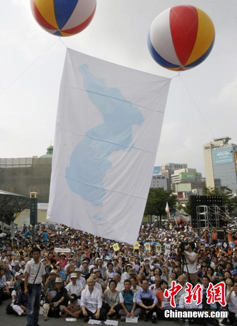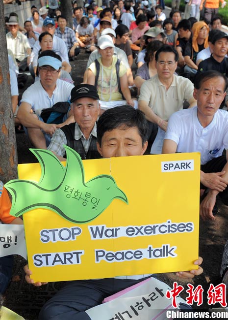 8月15日,在韩国首都首尔,韩国民众在战争纪念馆前集会,反对韩国与美国举行代号为“乙支自由卫士”的联合军演。