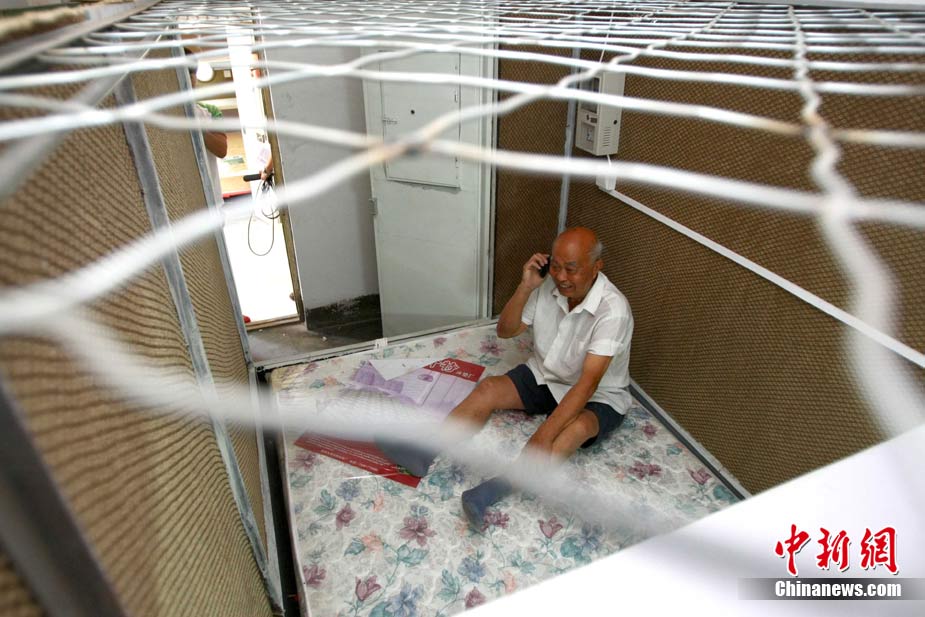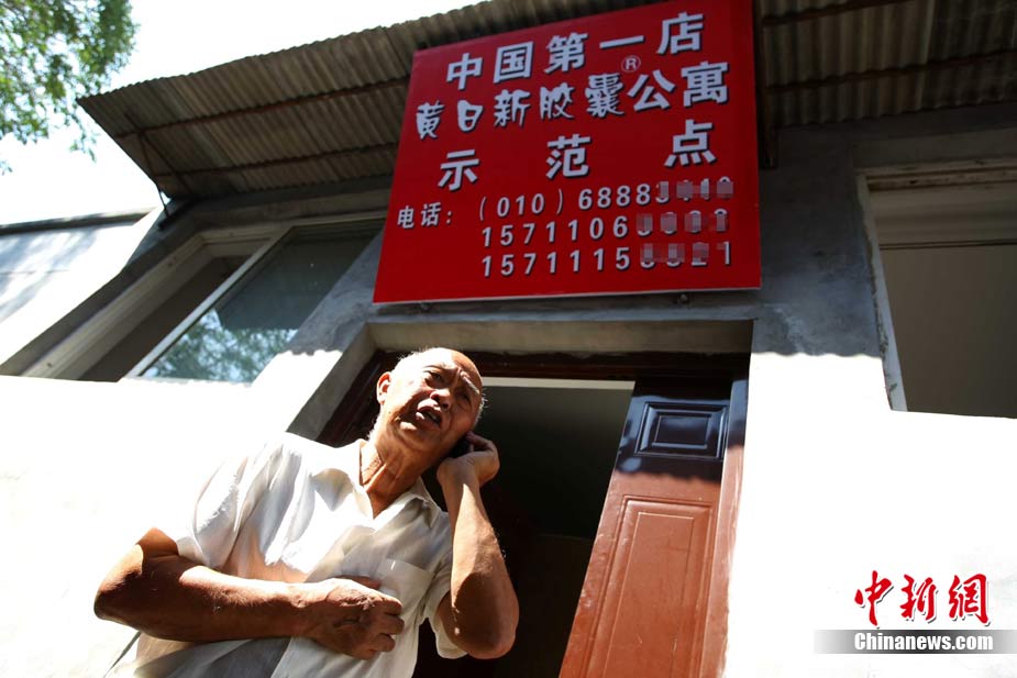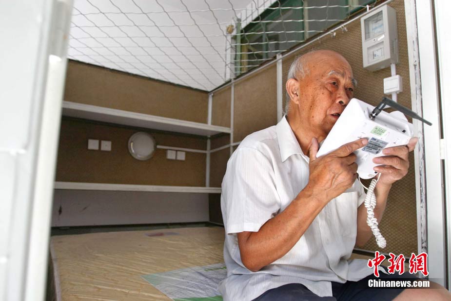 8月16日,在北京石景山区麻峪东街,78岁老人黄日新所建的第三代胶囊公寓开张。第三代胶囊公寓设有单人间和夫妻间(图),大小为长2.4米、宽1.2米(夫妻房宽1.6米)、高2米。每个胶囊房间采用席梦思床垫,在电脑桌上方安置床头柜,安装独立电表,并增设厨房和厕所。中新社发 富田 摄