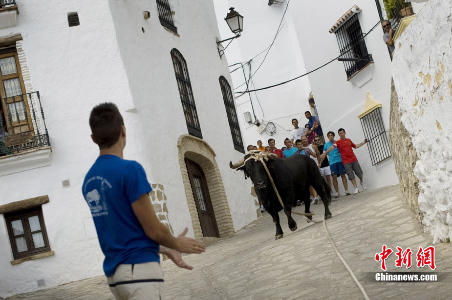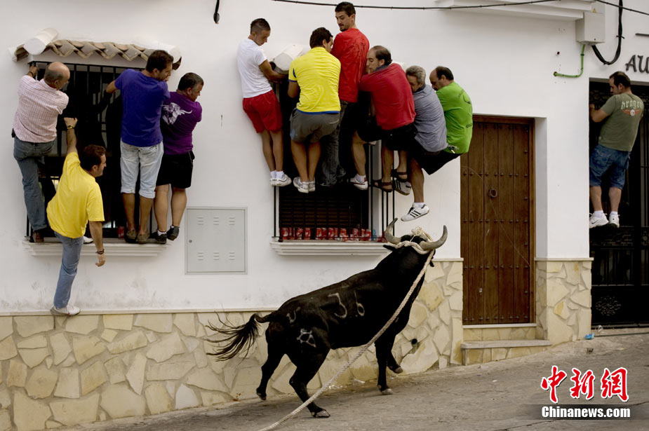 近日,西班牙罗萨里奥一个小城的居民在村中街道上玩起了斗牛。勇敢的年轻人一边挑衅愤怒的公牛,一边纷纷跳上房屋躲避。上演了一场街头斗牛。