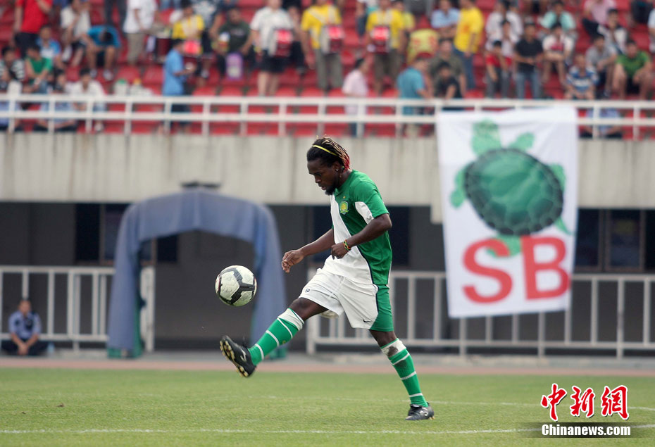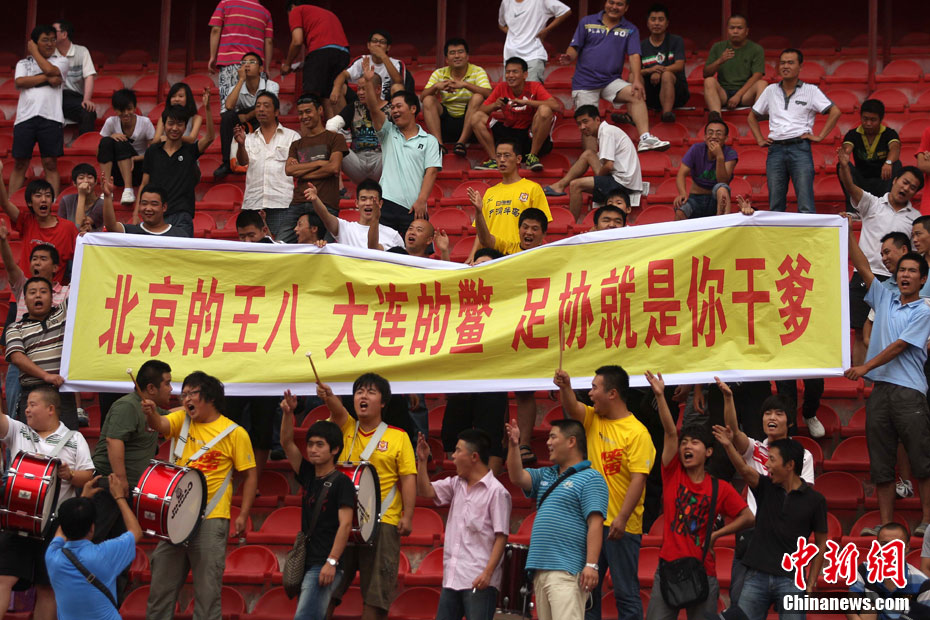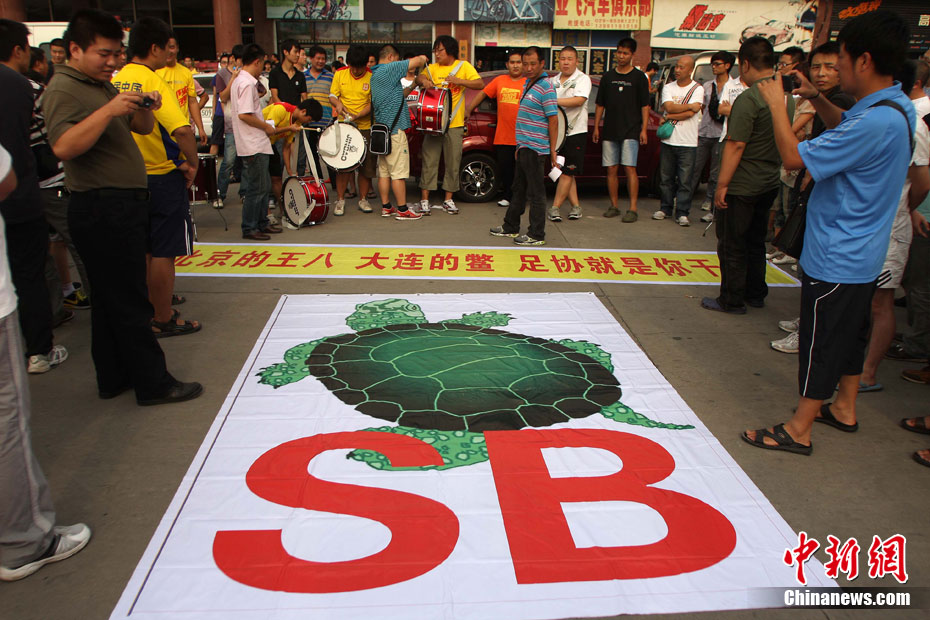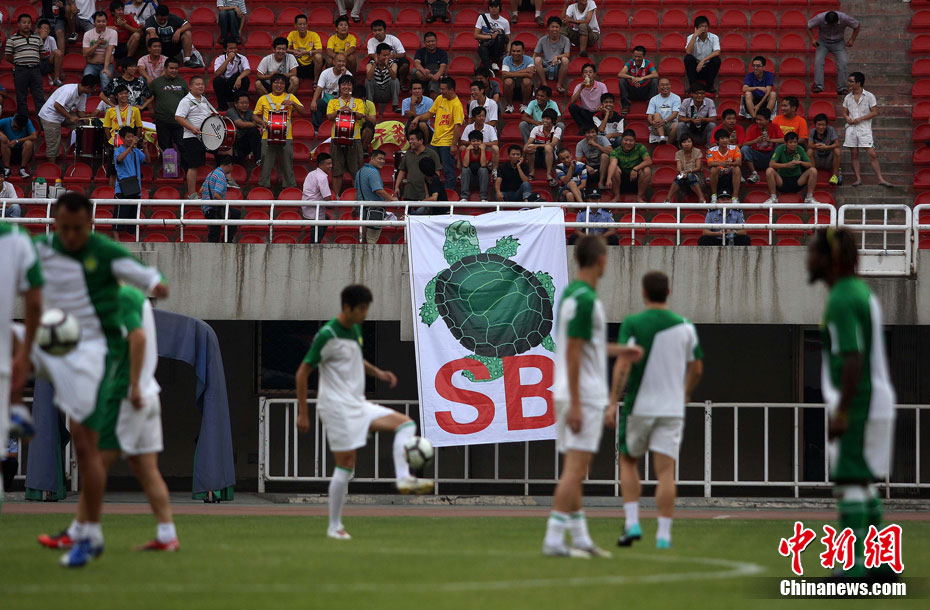 2010年8月17日,西安,北京国安队在陕西省体育场备战中超联赛第19轮和陕西队的客场比赛。陕西球迷“组团”来到现场,用持续不断的骂声干扰国安队战前的踩场训练,球迷们还打出了“绿乌龟”的画幅和各种标语暗讽国安。中新社发 梁萌 摄 图片来源:CNSPHOTO