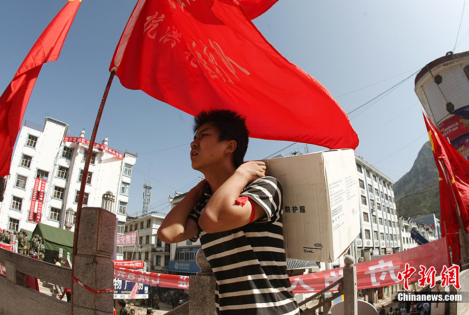 甘肃舟曲县发生特大泥石流后,截至19日,已导致1364人遇难,401人失踪,已解救1243人。前来抢险救援的人群中,一群年轻的志愿者在灾难面前挺身而出,他们大多数都是“90后”出生,有的来自附近村庄,有的来自其他省市,在灾区参与赈灾宣传、募捐、救灾物资搬运,成为抢险救灾的重要组成部分。中新社记者 杜洋 摄