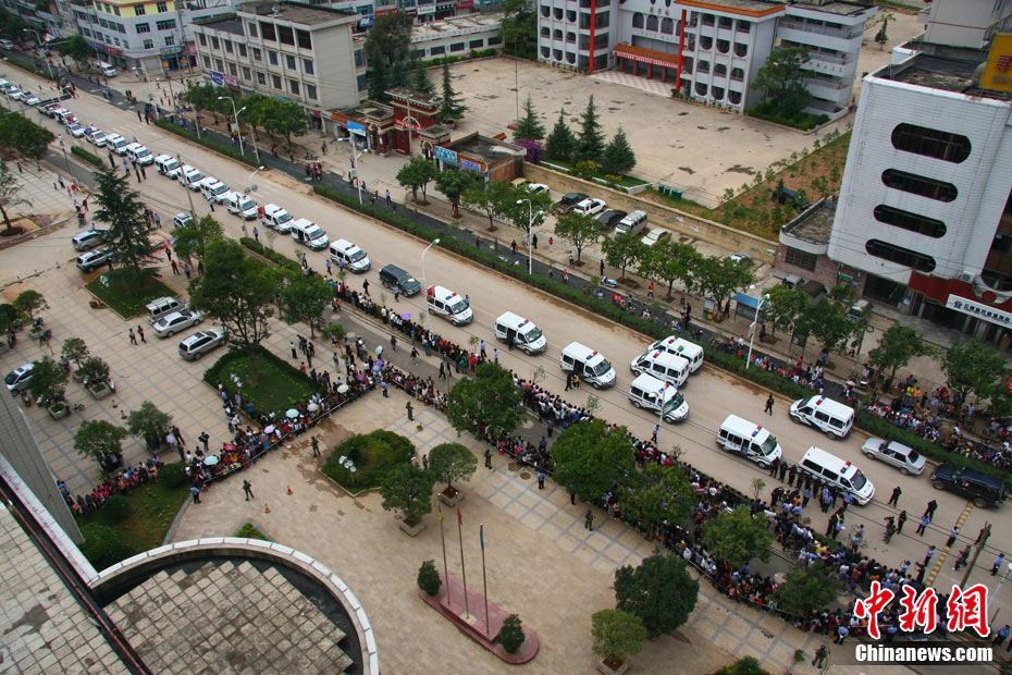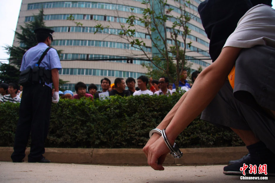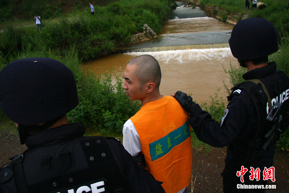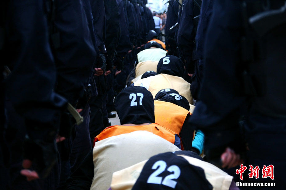 8月23日,昆明警方押解“洪兴帮”黑恶势力团伙21名主要犯罪嫌疑人指认现场。昆明警方连日来积极开展“严打整治行动”,于2010年5月成功捣毁长期在寻甸县作恶的“洪兴帮”黑恶势力团伙,缴获作案大型砍刀30余把,军用子弹58发,防刺服2件以及20余部通讯设备。中新社发 任东 摄