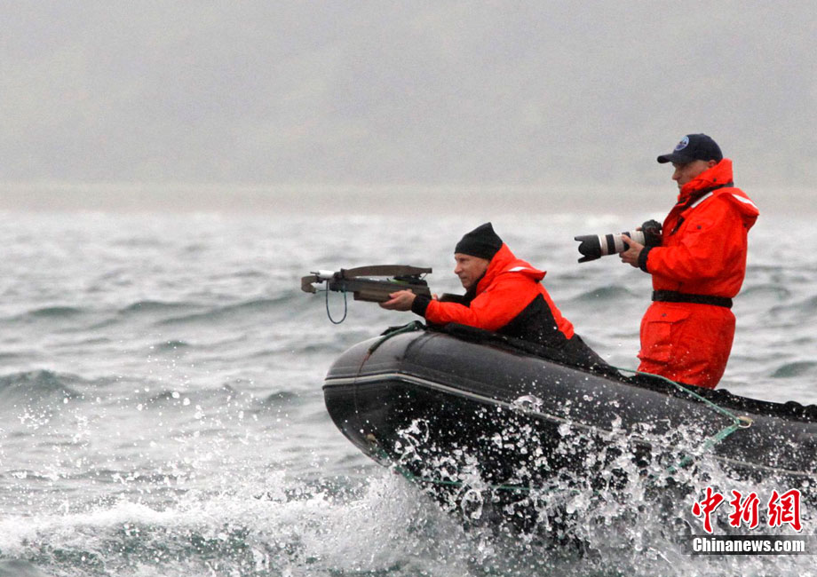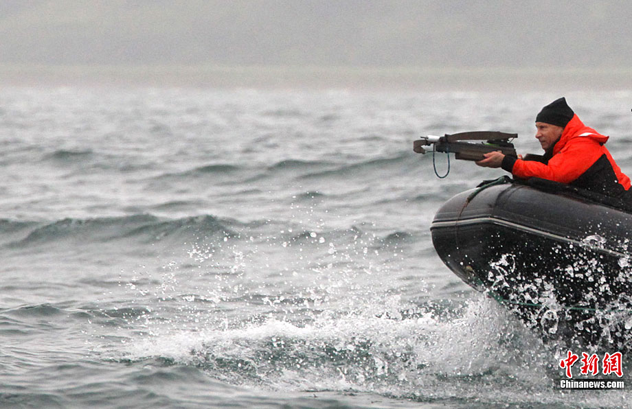 普京再秀男子汉气概 持劲弩追击灰鲸