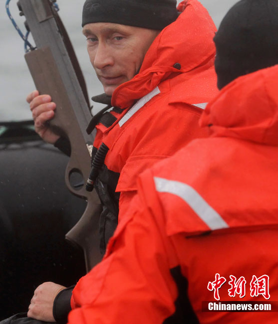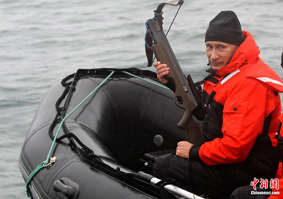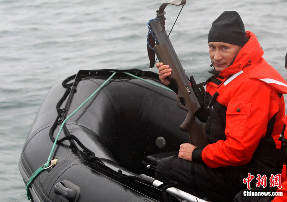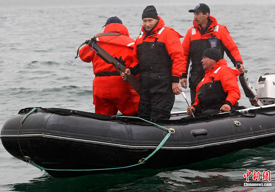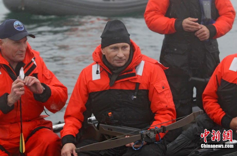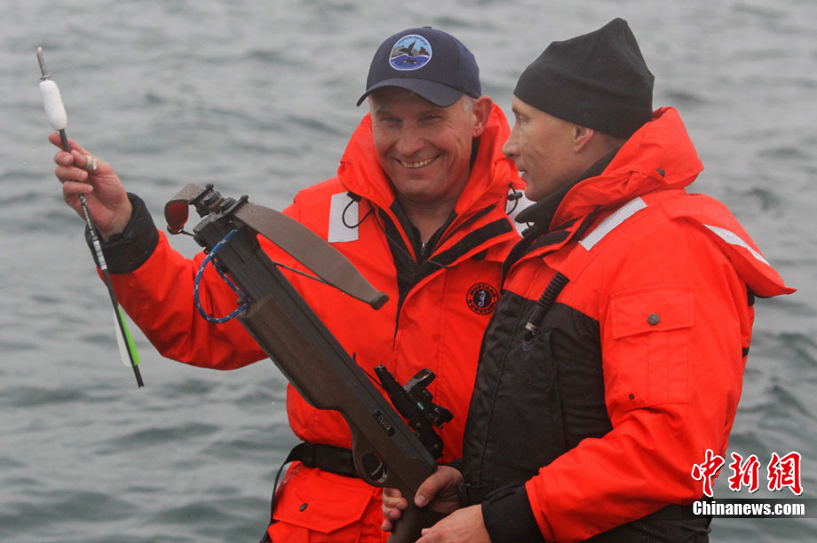 当地时间8月25日,俄罗斯总理普京在勘察加半岛附近的奥尔加港参与科学考察时,乘坐橡皮艇、手持劲弩,再次秀了一把射飞镖猎捕灰鲸的风采。