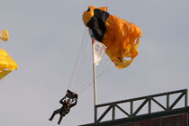 美伞兵跳伞被挂旗杆上