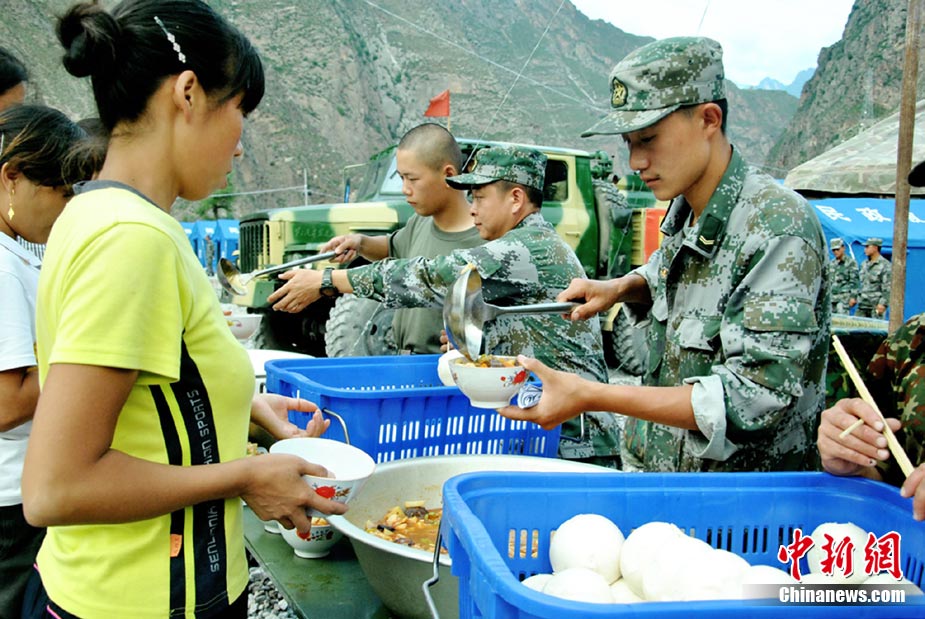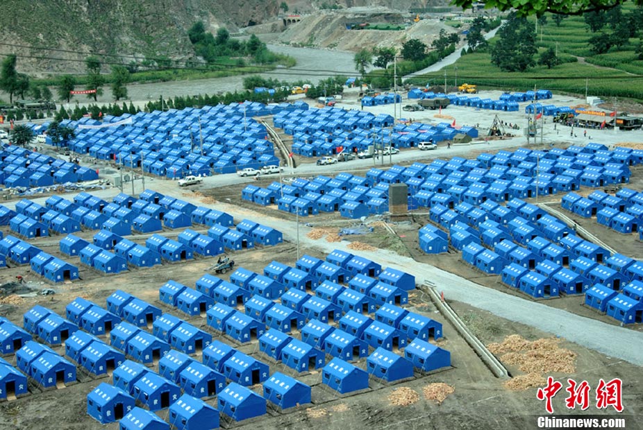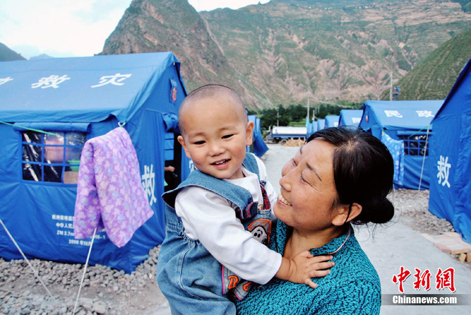 8月25日,舟曲泥石流灾区对受灾民众进行二次安置,将部分无家可归的民众安置到新搭建的沙川坝“帐篷社区”。图为奶奶愉快的对小孙子说:“咱们搬进新家了”。 中新社发 马晓俊 摄