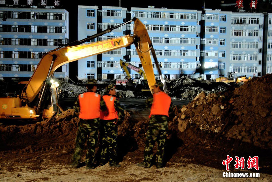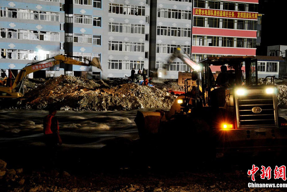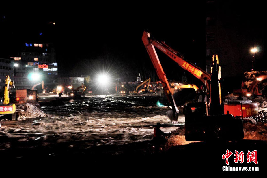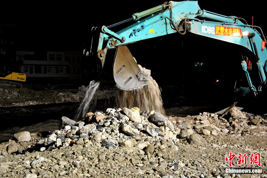为尽快消除舟曲特大泥石流形成的白龙江堰塞体,疏通河道,早日解除舟曲县城水患,武警水电部队官兵日夜艰苦奋战在在1.5公里的白龙江两岸抢险一线, 24小时昼夜挖掘和清理河道中的碎石淤泥,到目前水位下降已3米多 县城淹没房屋逐退水面。白龙江堰塞体抢险工作已全面进入冲刺阶段,图为8月26日晚11时左右武警水电部队官兵夜战白龙江的施工现场。中新社记者 侯志红 摄