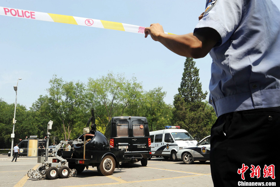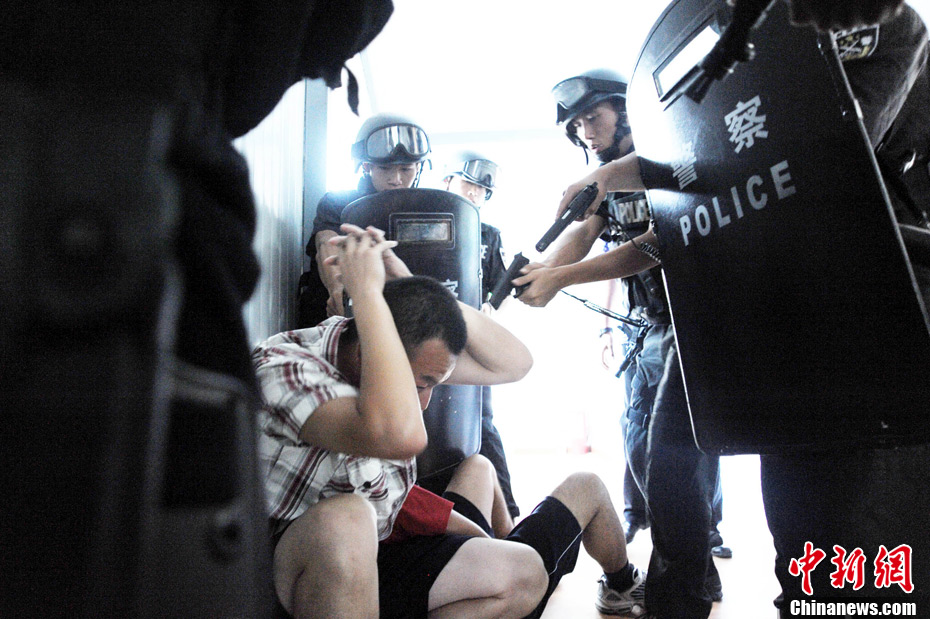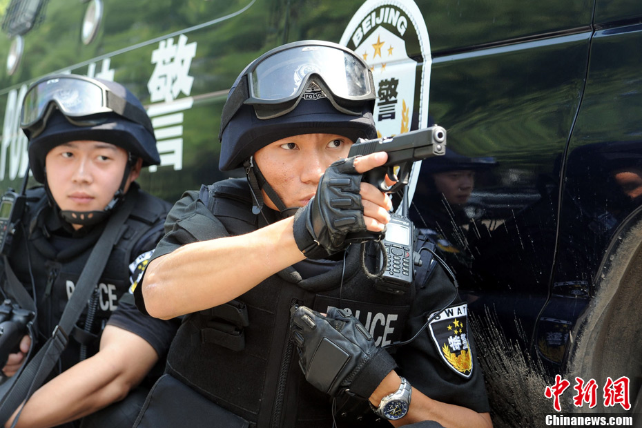 近日,北京警方在奥体中心体育馆、北京科技大学体育馆等4个场馆和4个住地同时举行多警种综合演练,通过演练检验实战效果和处突技能。根据预先制定的67个工作方案,有近11个警种在前期结合职责分工进行了单警种演练。本月27日起,涉及比赛和训练的所有场馆和住地将实行24小时封闭守护,北京警方将采取各种科技手段,确保首届武搏会安全顺利举办。中新社发 李连杰 摄