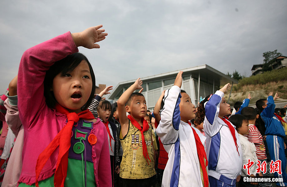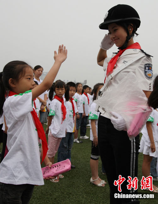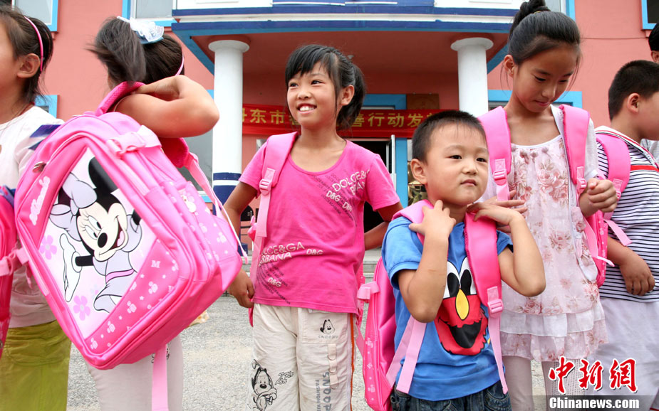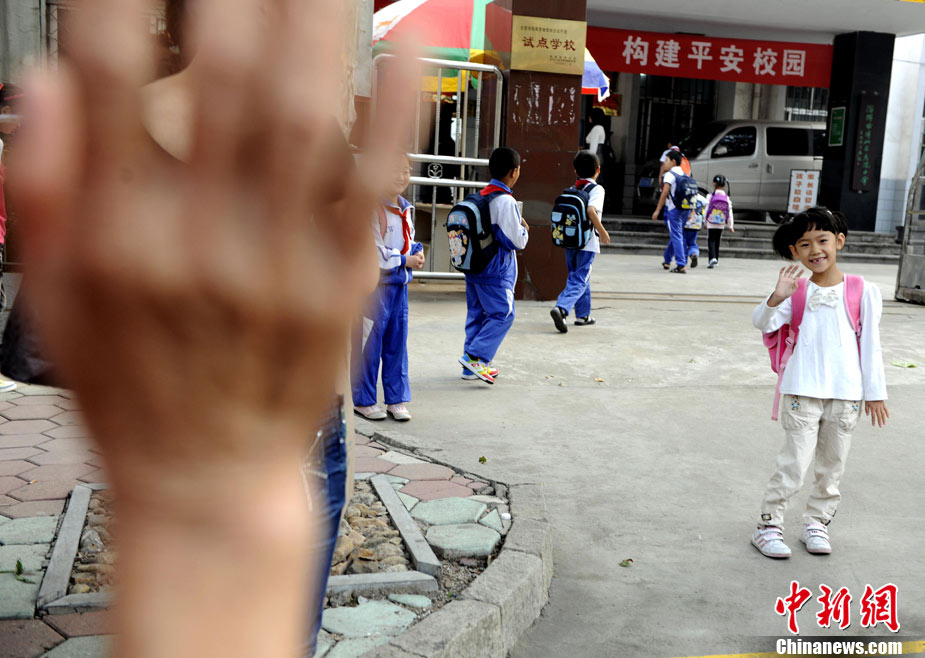 快乐的暑假结束了,全国中小学生陆续开学上课,迎来了新学期。图为8月30日,山东博山考院小学门前,一年级的子琰小朋友在学校警戒线外与家长再见。中新社发 刘震 摄