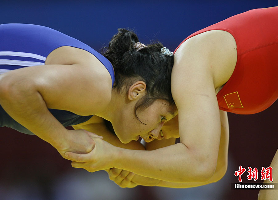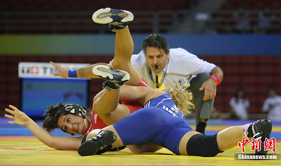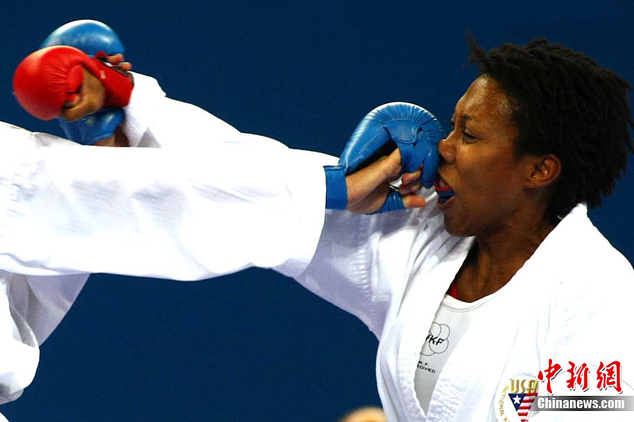 9月1日,2010年北京首届世界武搏运动会空手道项目在北京科技大学体育馆结束了全部争夺。图为在女子-68公斤级决赛中,来自美国的墨菲(Murphy)(图)被法国选手泛亚特(Fanjat)击中面部,最终不敌对手屈居第二。中新社记者 富田 摄