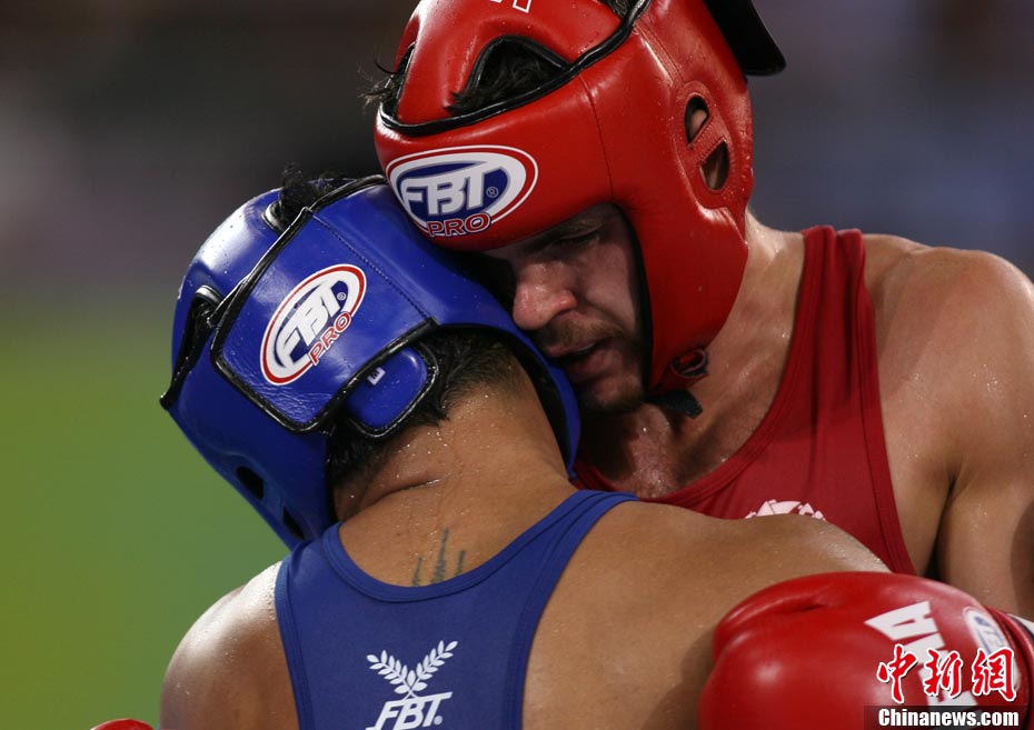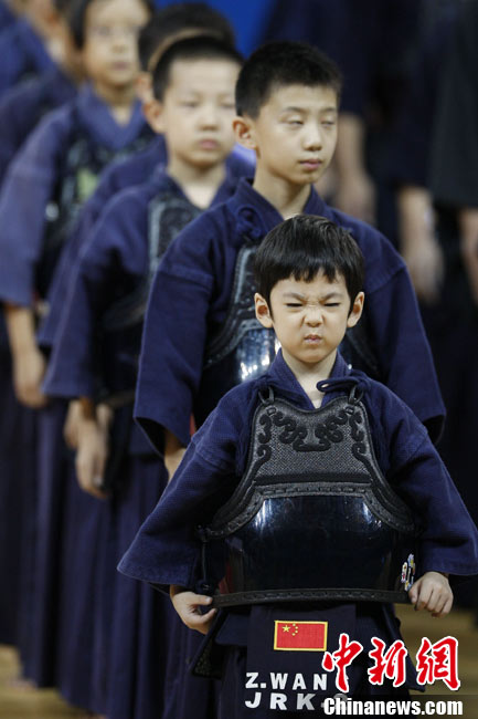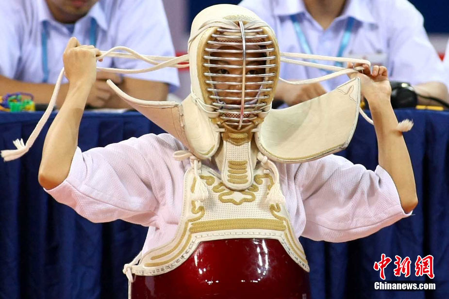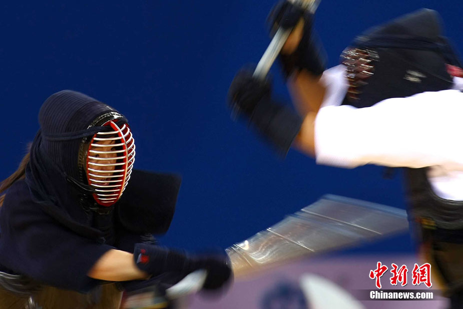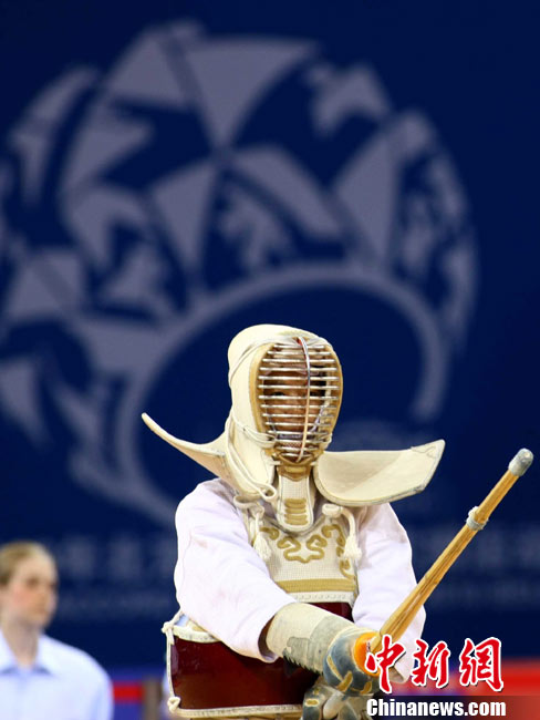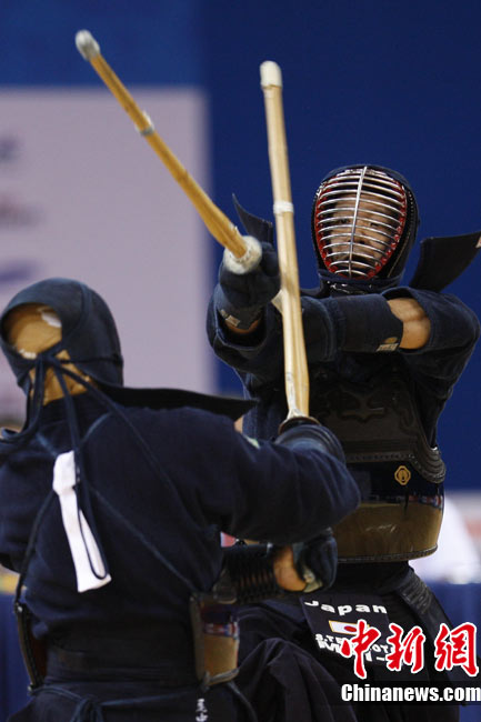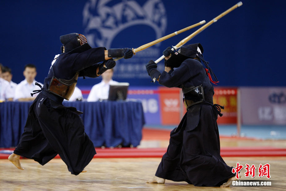 9月3日,2010年北京首届世界武搏运动会剑道比赛在北京科技大学体育馆开赛,当天举行男、女个人赛预赛和决赛及女子特殊邀请赛预赛和决赛。图为在男子个人邀请赛中,日本选手昭司寺本(Shoji TERAMOTO)(右)和巴西选手奥纳卡(Ernesto Eisaku ONAKA)在比赛中。中新社记者 盛佳鹏 摄