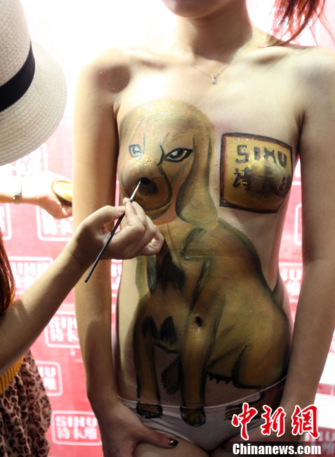 9月4日,正在上海国际展览中心举行的第十三届亚洲宠物展览会上,展商特意请来助阵的人体彩绘吸引了不少观众的眼球。中新社记者 汤彦俊 摄