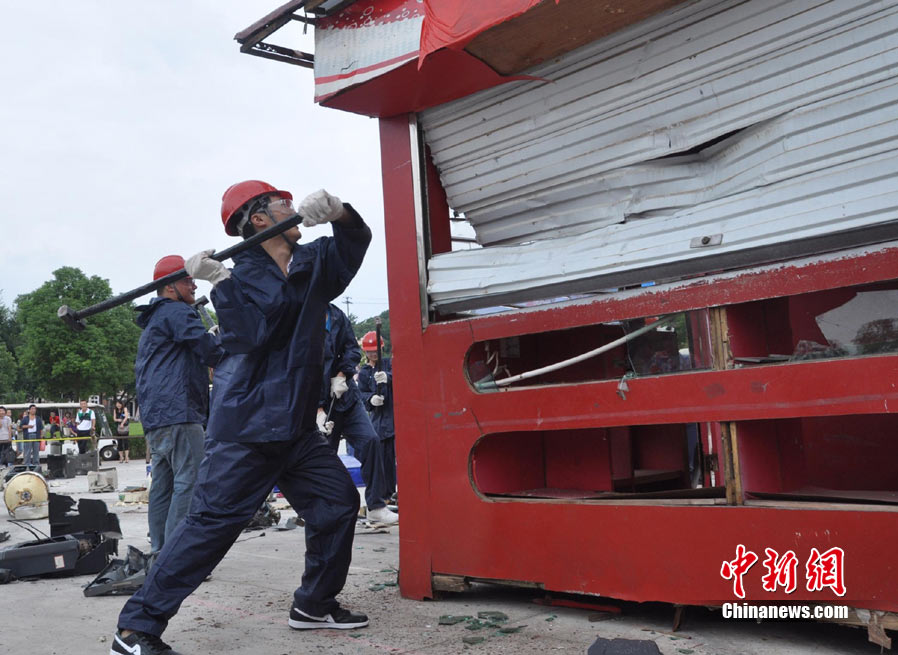 9月4日,一群全副武装、手持铁锤的都市人在长沙世界之窗内广场上疯狂锤砸废旧小铁屋,以此宣泄心中的压力。据悉,为帮助都市人群释放因工作、生活带来的压力和郁闷,长沙世界之窗从当日开始举行为期一个月的减压节。主办方将收集来的摩托车、小车、电视机、洗衣机等废旧设备摆放在预设的场地内,每天召集数十名游客参与其中。 中新社记者 肖前辉 摄