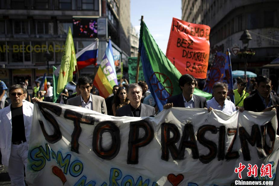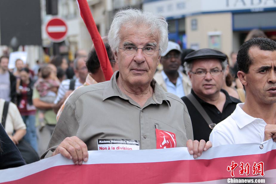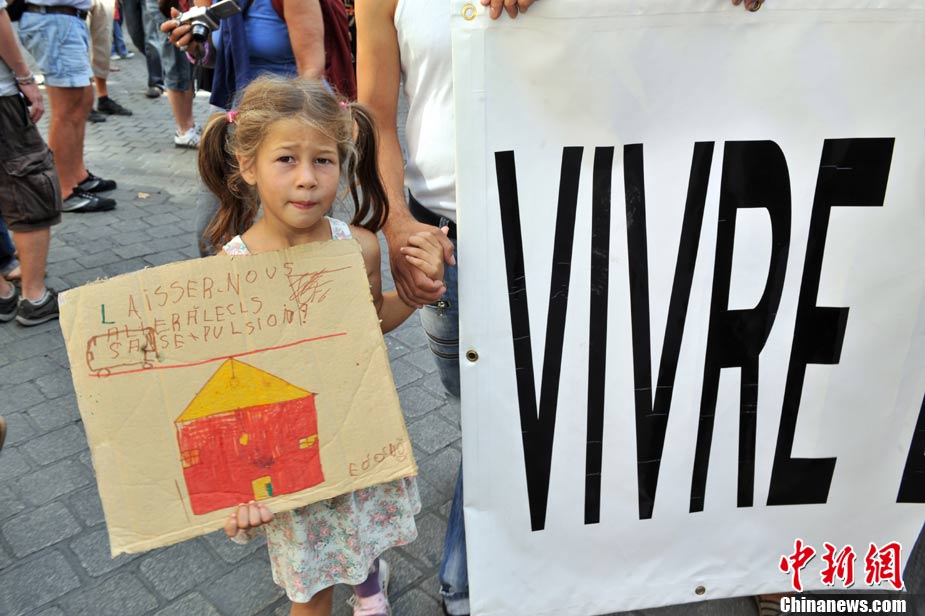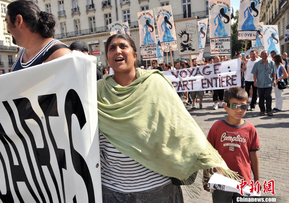 法国全国各地4日有数以万计的群众上街示威,抗议政府最近采取新政策,强行驱逐吉卜赛人出境。欧洲其它城市包括贝尔格莱德和罗马,也有群众游行声援吉卜赛人。图为在法国南特,民众示威抗议政府强行驱逐吉普赛人。