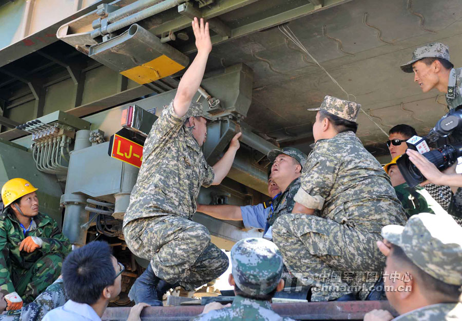 顾不上长途奔波和路途劳累的参演官兵,到达换装点后就立即开始了换乘换装。经过近6小时的卸载、装载,中方参演部队的装备车辆全部驶上了哈方军列,并在铁路专业装卸队的协助下,对20吨以上轮式装备按照哈方的要求进行捆绑加固。