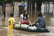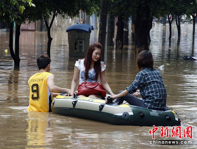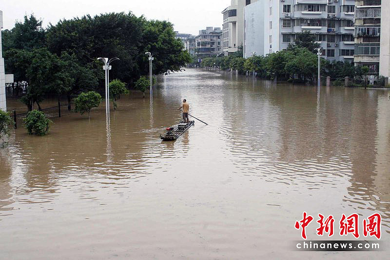 2010年6月17日,广西桂林市出现大到暴雨、局部大暴雨天气。漓江洪水倒流入市区,市民坐竹排出行。东华/CFP