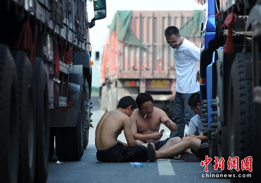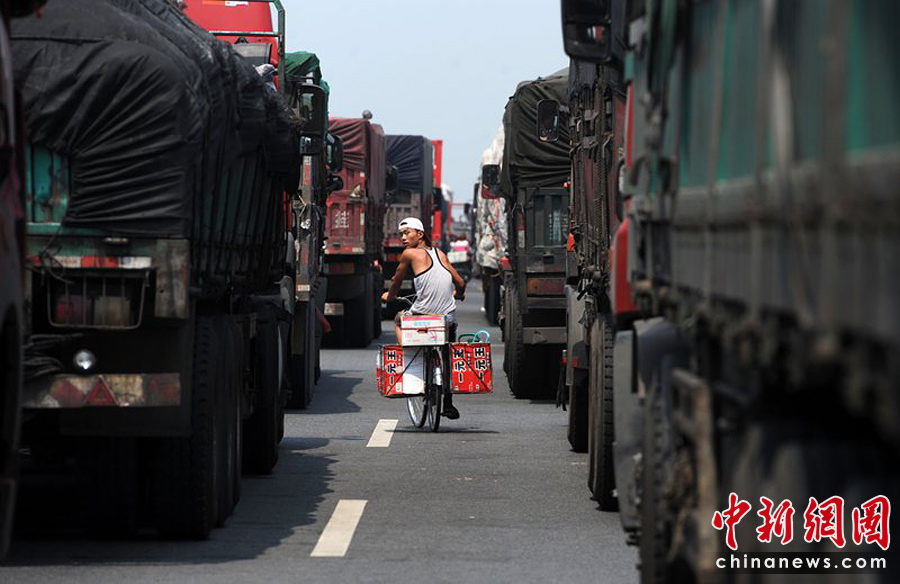 6月21日,施工20天的110国道延庆县境内的四座桥梁维修完毕,道路恢复畅通,但拥堵了20多天的京新高速,缓解情况却不大。几小时走上两三公里的速度,实在让人难以忍受,但长期跑这趟线路的大货车车司机称,车能走动,就已经庆幸了,仅仅10几公里的路,被堵三天三夜的情况以前是经常出现。图为23日在滞留的车队中,不断有开着摩托车的小贩在大货车之间穿插以做点生意。王苡萱/CFP