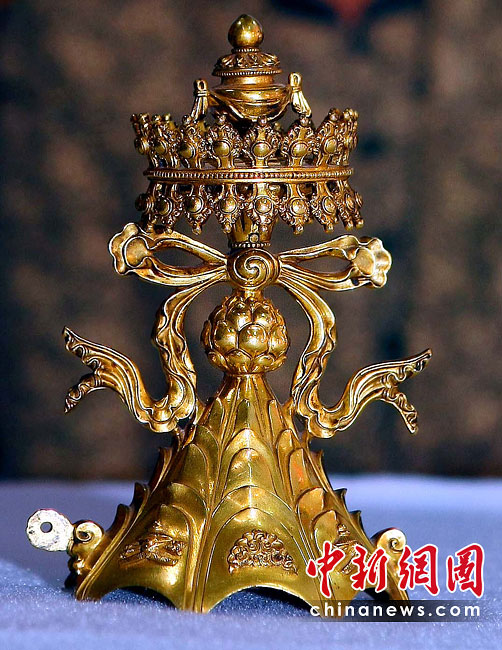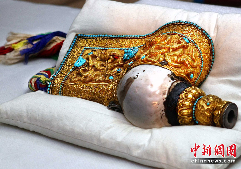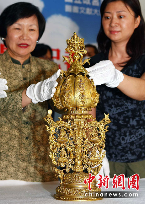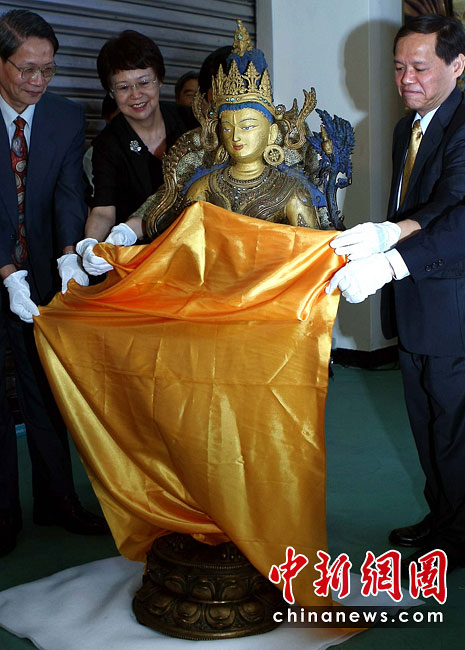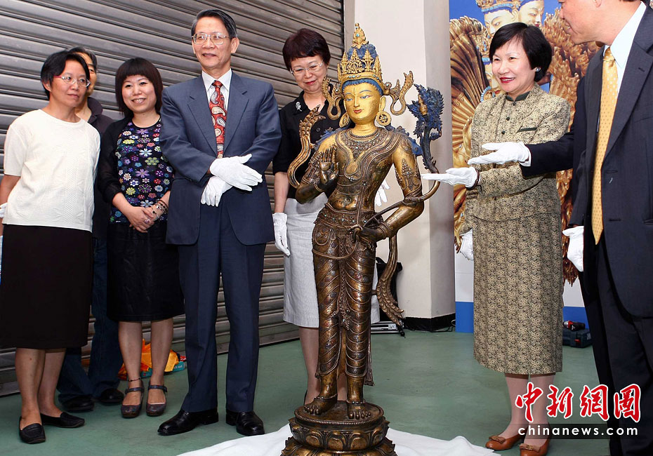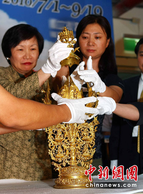 6月25日,工作人员将“鎏金铜弥勒菩萨像”、“金翅白海螺法号”、“八瓣莲花曼荼锣”等3件重量级文物开箱。7月1日,台湾故宫博物院将举办“圣地西藏---最接近天空的宝藏”特展,展览分“吐蕃王朝”、“金色宝藏”、“文化交流”、“雪域风情”四部分,共有130组件文物参展。中新社记者 宋吉河 摄