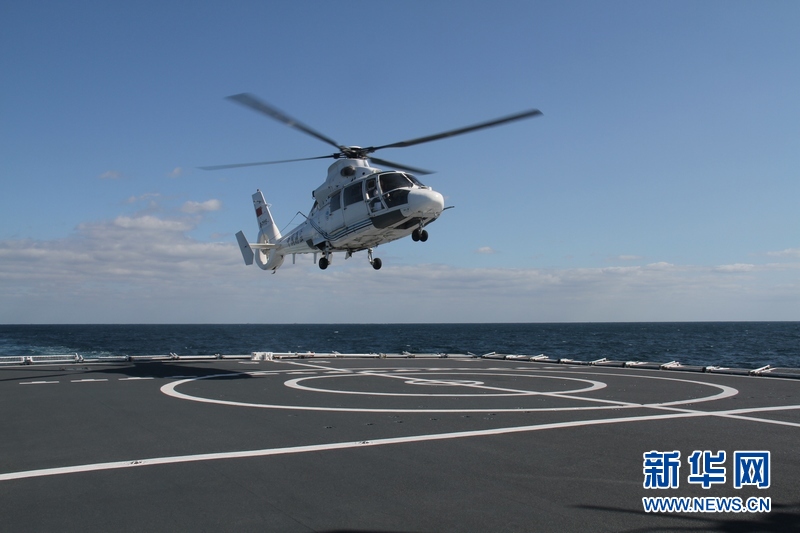 运送“伤员”海监直升机降落在“和平方舟”医院船。王经国 摄 图片来源:新华网