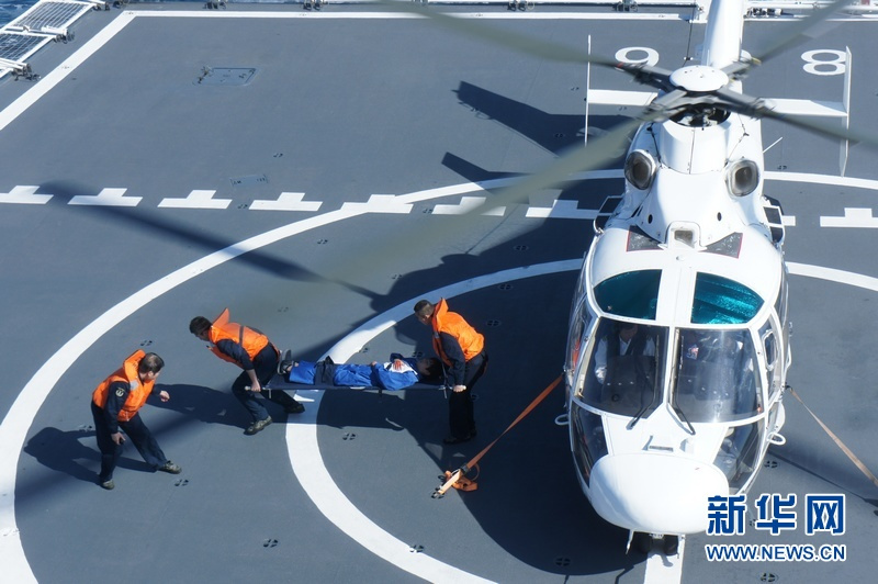 医护人员从直升机上将“伤员”运送至病房。孟彦 摄 图片来源:新华网