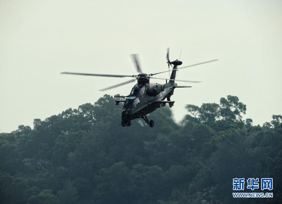 2012年11月11日,国产武直10武装直升机在珠海三灶机场进行飞行训练。当日,我国自主研制生产的武直10武装直升机在珠海三灶机场进行了约20分钟的适应性飞行训练,做出倒飞、莱维斯曼机动、高速大角度俯冲、低空小半径盘旋等动作,展现出其优异性能,引来航展现场观众频频喝彩。杨光 摄 图片来源:新华网