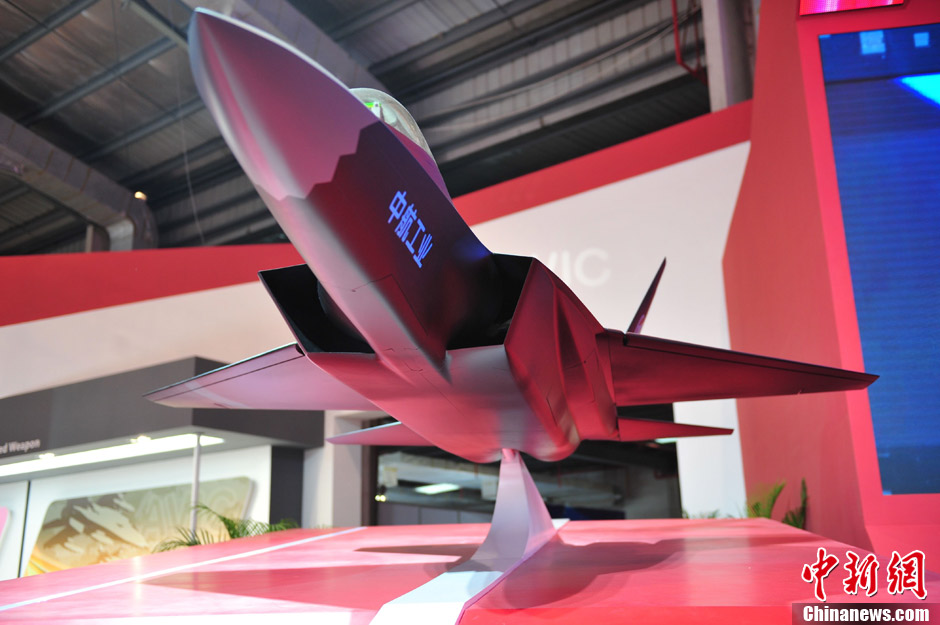 11月13日上午,第九届中国国际航空航天博览会在广东珠海开幕,一架中国先进战斗机概念模型在中航工业展台亮相,从外形上看,与前不久成功试飞的歼31相似,备受关注。中新社发 柯小军 摄