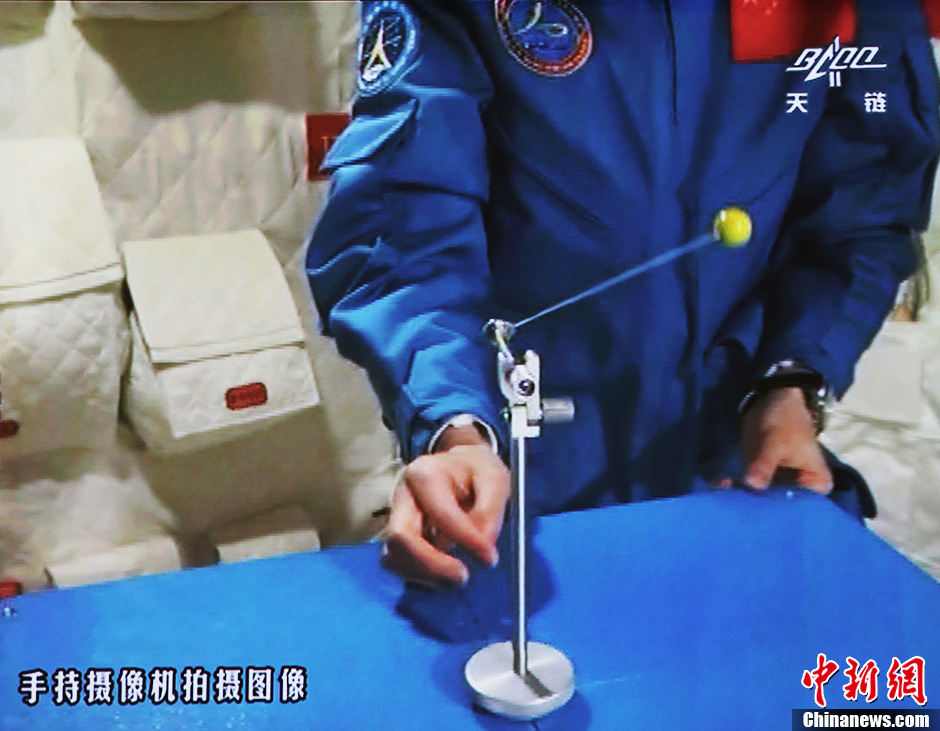 6月20日10时许,神舟十号航天员在天宫一号开展基础物理实验,为青少年进行中国首次太空授课。图为王亚平讲授太空失重提供条件下的单摆演示。中新社发 秦宪安 摄
