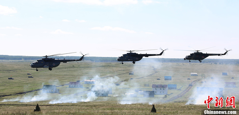 8月12日,“和平使命-2013”联合反恐军演中俄两军参演部队在切巴尔库尔合同训练场举行全员全要素实兵协同训练。双方共出动官兵近900人,坦克、步战车、直升机等武器装备约130台,双方导演部总导演——俄中部军区司令员波格诺夫斯基和沈阳军区副司令员石香元,共同到演习地观摩并指导两军训练。图为陆航编队实施空中侦察。中新社发 李祥辉 摄
