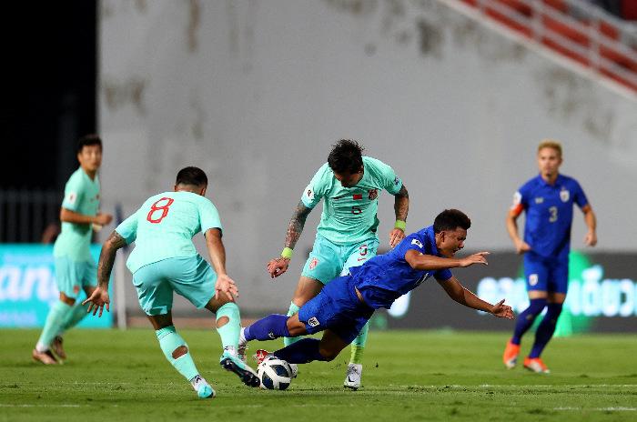当地时间11月16日,在世预赛36强赛C组首轮角逐中,中国男足客场2:1胜泰国队。据悉,中国队所在小组的对手是韩国队、泰国队和新加坡队,四支球队将进行主客场循环赛。图为中国队球员武磊(左)与泰国队球员在比赛中。