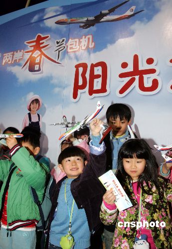 二月十四日,东航世博号A340-600飞机首次执行两岸春节包机重任,从上海飞至台北,搭乘该包机的三十名台胞小童获得“阳光小旅客”称号。图为台胞小童在上海登机时喜获世博号飞机模型和2010年上海世博会参观券。中新社发 潘索菲 摄