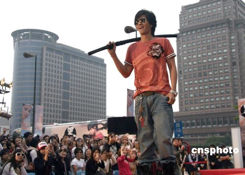 四月十五日,在台湾人气甚高的艺人“小猪”罗志祥为其代言的牛仔服饰品牌“BIG TRAIN”登台走秀。数百名粉丝很早就赶往现场等候偶像。中新社发 翁阳 摄