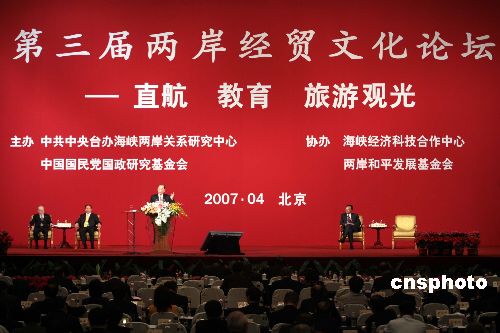 四月二十八日,第三届两岸经贸文化论坛在北京举行,本届论坛的主题是“两岸直航、旅游观光、教育交流”,两岸与会代表首先就“两岸直航”进行了专题讨论,涉及到了空中直航、“小三通”以及海上通航。图为专题讨论现场。中新社发 盛佳鹏 摄