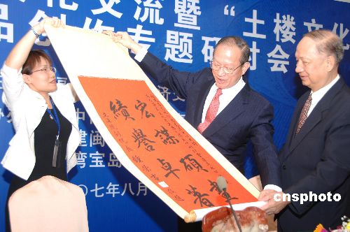 | 8月6日上午,历时四天的“闽台客家文化交流研讨会”在福州开幕。来自海峡两岸的专家学者就以“土楼文化”为主题的文学、影视作品创作和传播等进行研讨。研讨会由福建省文化经济交流中心主办,台湾台中市客家公共事务协会、福建闽西客家联谊会、台湾宝岛客家广播电台协办。图为开幕式上,台湾客家专家学者代表团名誉团长、台湾亲民党荣誉副主席钟荣吉(中)向福建省文化经济交流中心理事长游德馨(右)赠送书法作品。中新社发 郑祚声 摄