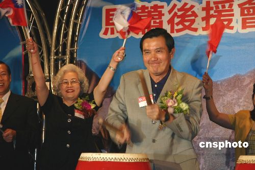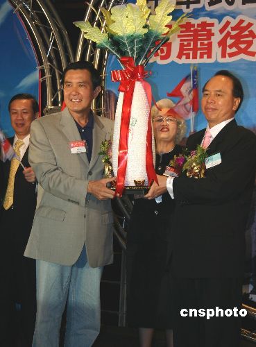 台湾工商建设研究会八月二十二日成立“马萧后援会”,工商建研会理事长颜文熙向马英九赠送“菜头”工艺品,希望马英九在明年大选取得“好彩头”。中新社发 曾嘉 摄