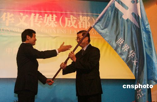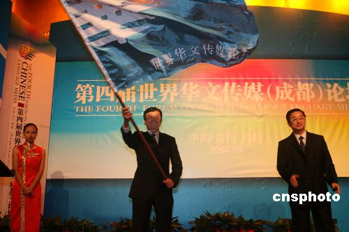 9月4日,第四届世界华文传媒论坛在成都闭幕,图为成都市政府代表郝康理(左)向上海市政府代表崔明华交接会旗。第五届世界华文传媒论坛将于2009年在上海举办。中新社发 张勤 摄