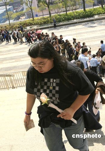 三月二日,已故艺人沈殿霞的追思会《肥姐 我们永远怀念您》在香港红磡体育馆举行,近万名肥姐的亲友和市民出席。图为民众手捧鲜花排队入场。中新社发 王丽南 摄