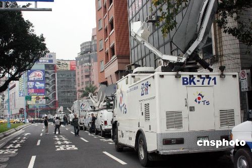 二00八台湾地区领导人选举投票三月二十二日上午八点开始,中国国民党候选人马英九、萧万长竞选总部外,大批电视直播车云集,随时做连线报道。中新社发 黄少华 摄
