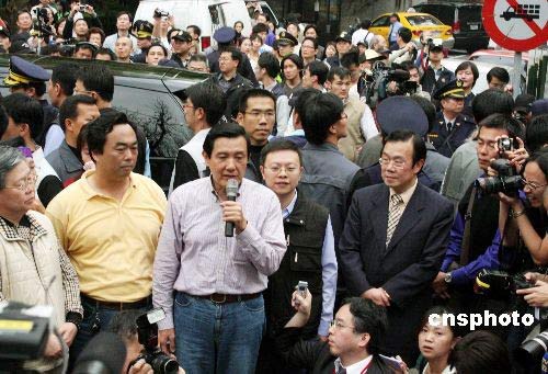 三月二十二日,二00八台湾地区领导人选举投票。中国国民党候选人马英九在台北一个投开票所投票后,接受众多媒体的采访。中新社发 黄少华 摄