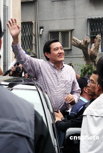 马英九在台北一个投开票所投票后,离去时向民众挥手致意。