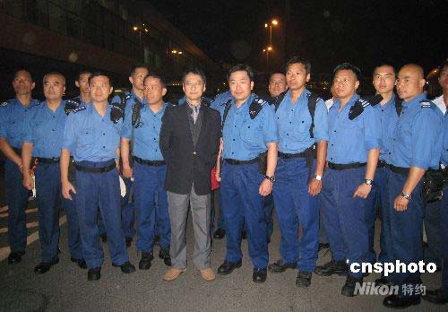 五月十五日凌晨,香港特区政府派出的二十人搜救队伍,抵达四川地震灾区协助搜救工作。搜救队成员包括消防处特别救援队十五名消防员及三名救护员,以及卫生署一名医生及护士。图为香港特别行政区政府驻成都经济贸易办事处主任陆仿真(中)与搜救队员合照。中新社发 中新社/政府新闻处 摄