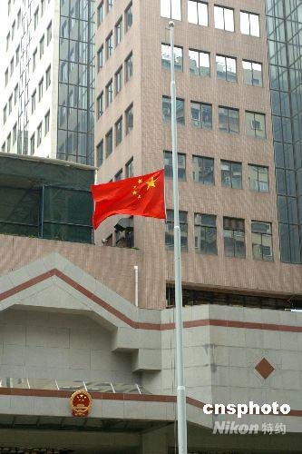 五月十九日八时整,中央人民政府驻澳门联络办公室降半旗,向四川大地震遇难同胞致哀。澳门中联办已致电四川省人民政府,对在地震中遇难同胞表示深切的哀悼。中新社发 史利 摄