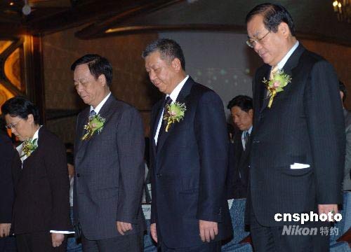 五月十九日,澳门特首何厚铧(右二)在美高梅金殿默哀,悼念四川地震遇难同胞。当日至二十一日为全国哀悼日。中新社发 史利 摄